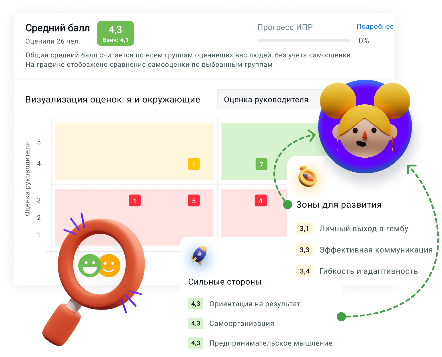 Узнать подробнееСистема автоматически формирует наглядные отчёты, тепловые карты и внутренние бенчмарки по компетенциям
