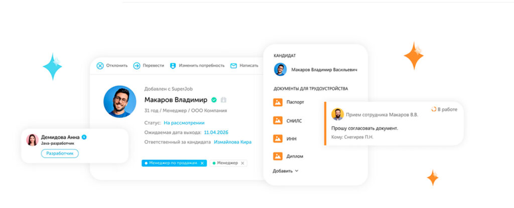 В крупных холдингах система подбора почти никогда не живет сама по себе. Она постоянно соприкасается с кадровым контуром, сервисом заявок, согласованиями, проверками, документооборотом, корпоративными коммуникациями и аналитикой.