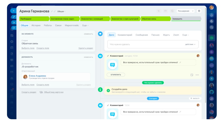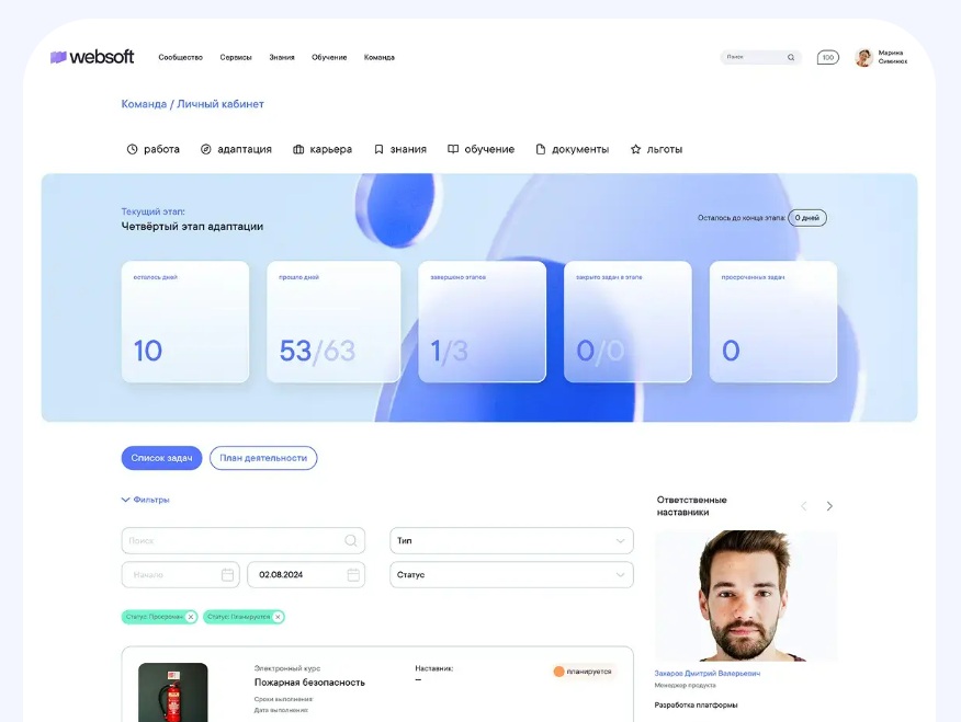 - Отдельный модуль адаптации с чек-листами и задачами.