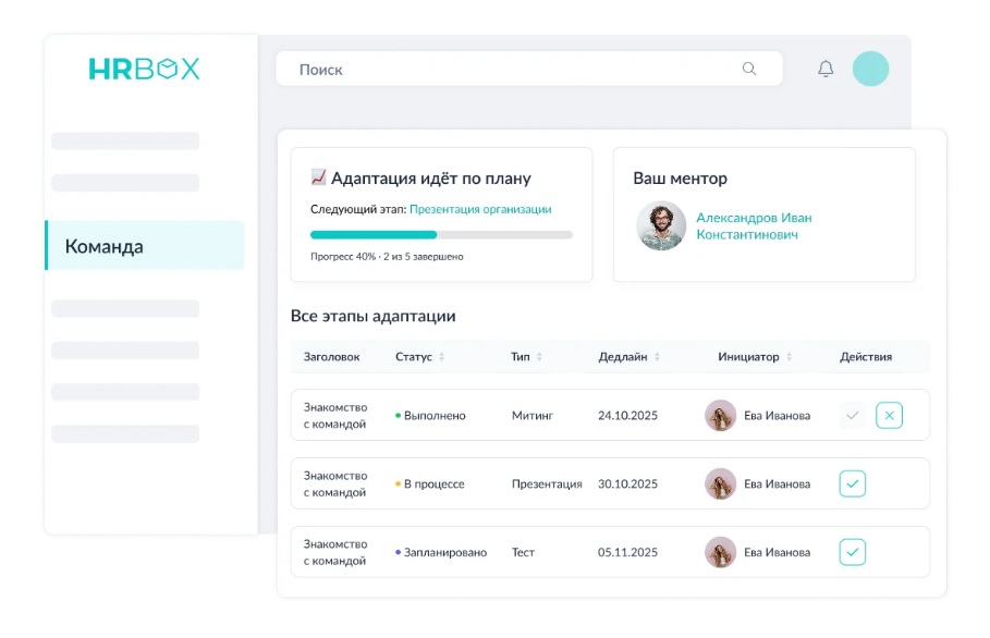 Наставничество. Наставники помогают новичкам быстрее адаптироваться, но управлять этим процессом вручную сложно, особенно при большом потоке новичков. Поэтому встроенный модуль наставничества с назначением менторов, отслеживанием встреч и обратной связью — важный фактор успешной адаптации.