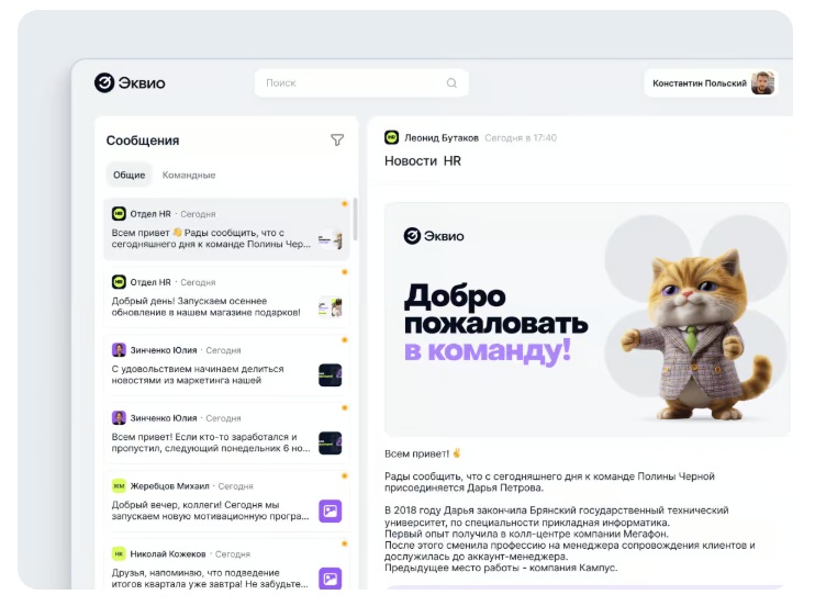 - Корпоративная соцсеть и встроенный мессенджер «Коннект» для командной коммуникации