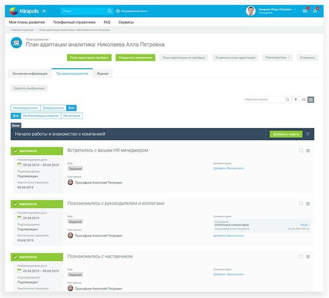- Институт наставничества: назначение наставников, автоматическая организация встреч, комментарии по ключевым этапам.