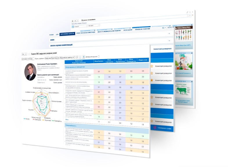- Связь с системой обучения, корпоративным порталом, модулем обратной связи и модулем управления целями.