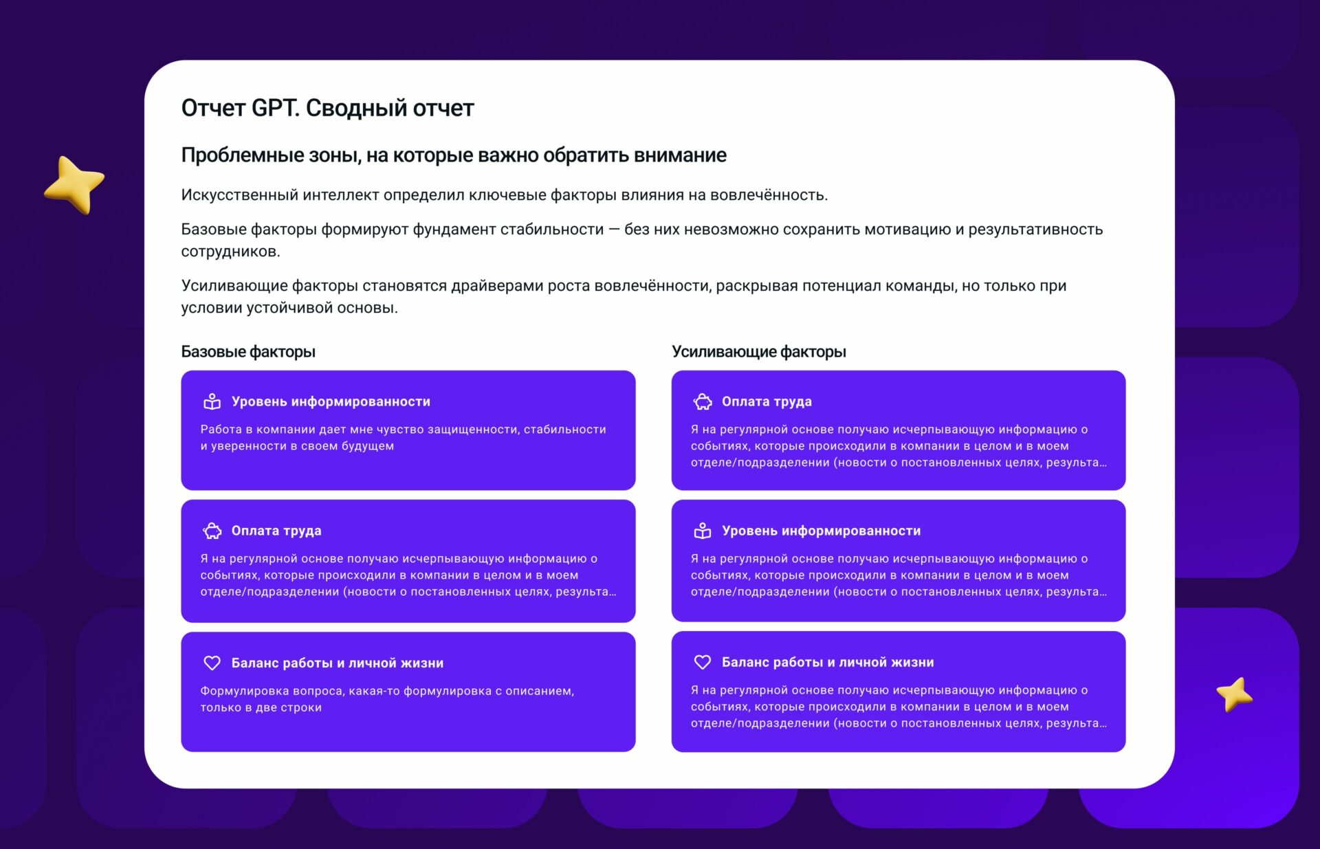 Сводный отчет GPT был полностью переработан. Теперь данные в нем структурированы и готовы к использованию сразу после завершения опроса. В отчет добавлены цитаты из ответов сотрудников, которые помогают увидеть реальные формулировки и ключевые болевые точки в командах.