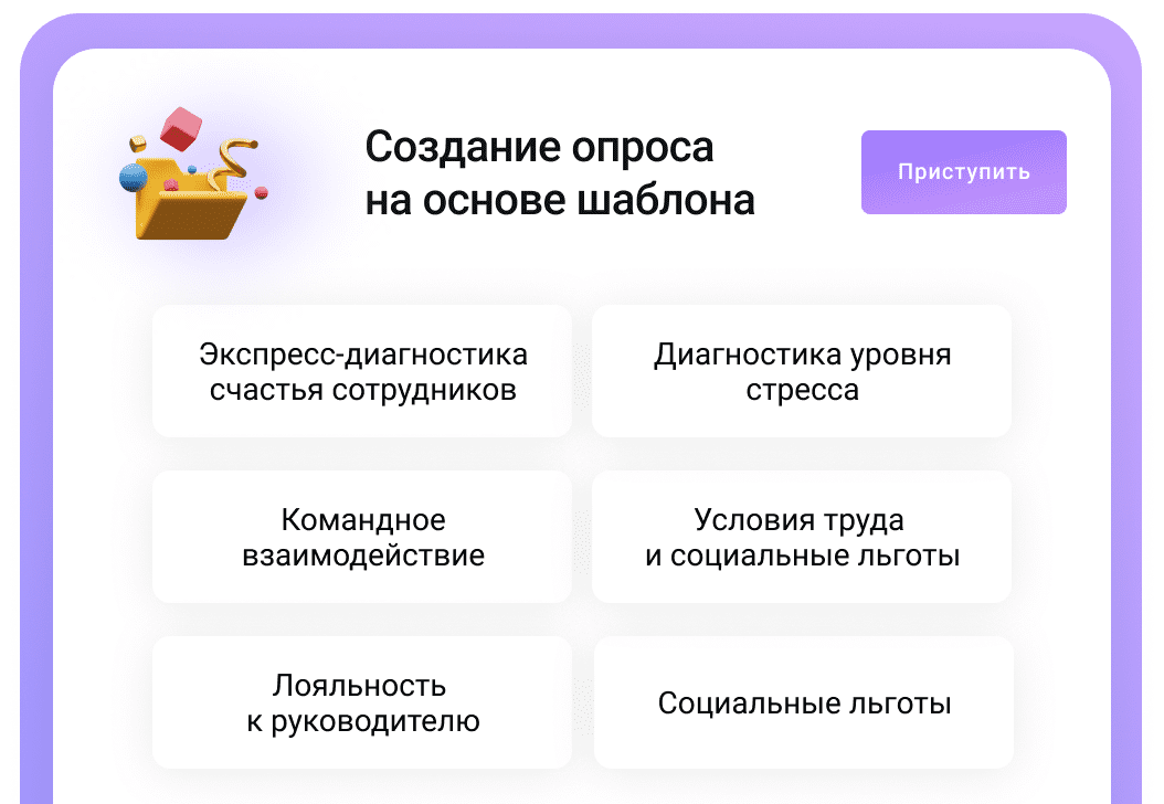 Эмоциональное выгорание часто увеличивает вероятность ошибок, а значит — и несчастных случаев. Снизить риски можно благодаря регулярному проведению опросов в компании: от wellbeing до того, насколько понятны регламенты поведения на производстве. В этом вам поможет «Поток Опросы» — цифровое решение для проведения регулярных HR-опросов. Выбирайте готовые шаблоны опросов или составяйте свои вопросы. А запускайте опрос на всю компанию всего за 1 клик.