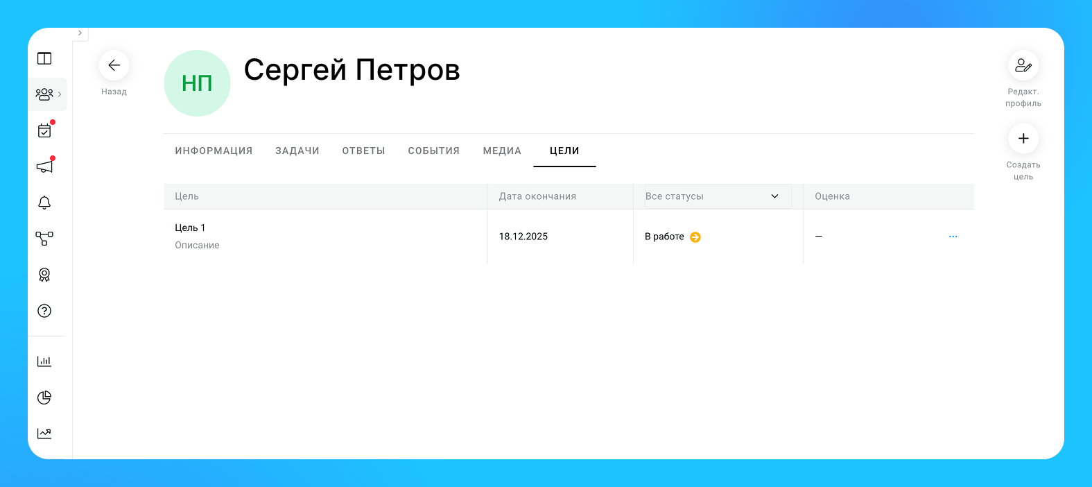Новая функциональность доступна в разделе «Все сотрудники → Цели». HR или руководитель открывает карточку сотрудника и работает с целями в одном окне: можно создать новую цель, отредактировать существующую или архивировать ту, что потеряла актуальность.