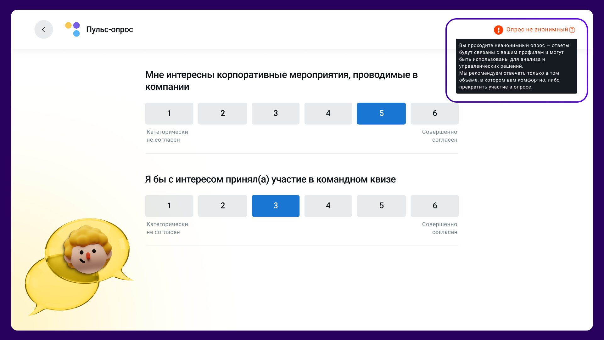 Неанонимные опросы — это формат, в котором ответы респондентов привязаны к их данным. Администратор видит, кто и как ответил, а значит может использовать результаты для персонализированной коммуникации. При прохождении такого опроса сотрудник сразу видит уведомление о том, что опрос не является анонимным.