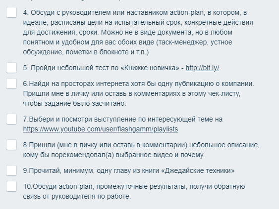 Сейчас в компании используется “индивидуальный” план работы в виде чек-листа в Trello. Среди стандартных пунктов первых недель есть «Мне чётко сформулировали мои основные задачи на испытательный срок» и «Я знаю, каких результатов от меня ждут по итогам испытательного срока». Это даёт менеджерам свободу оговорить нюансы и учесть предложения/пожелания новичка на будущее – в процессе адаптации, а не до неё.