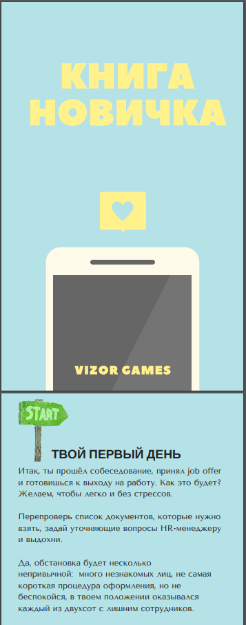 Например, была книга новичка на несколько печатных страниц, в которой были затронуты основные моменты: информация о компании, её целях и проектах, организационные детали (график работы, учёт рабочего времени, внешний вид, больничные, отпуска и бонусы, структура компании итд)
