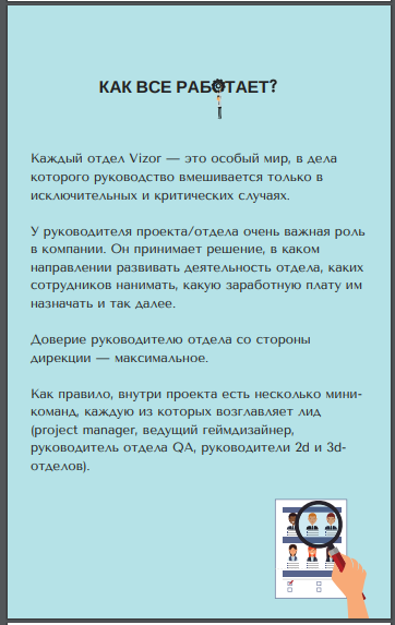 В конце испытательного срока после того, как с новичком поговорит руководитель, беседу проводит и HR. Для этого используется опросник Q12, после беседы новичок получает электронную «Vizor. Книга историй». В ней собраны мемы, байки и истории сотрудников, накопившиеся за 10 лет в индустрии. На последних страницах есть список «50 пунктов, которые должен выполнить каждый вайзорчанин».