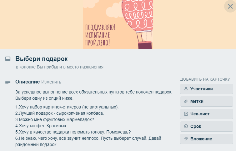 Те, кто подключился к доскам в Trello на старте, сами могут напомнить менеджеру о том, когда пришло время «Обсудить action-plan, промежуточные результаты, получить обратную связь от руководителя по работе». Такая инициатива, с одной стороны, это подстраховка для HR’а, с другой – плюс сотруднику в глазах менеджера.