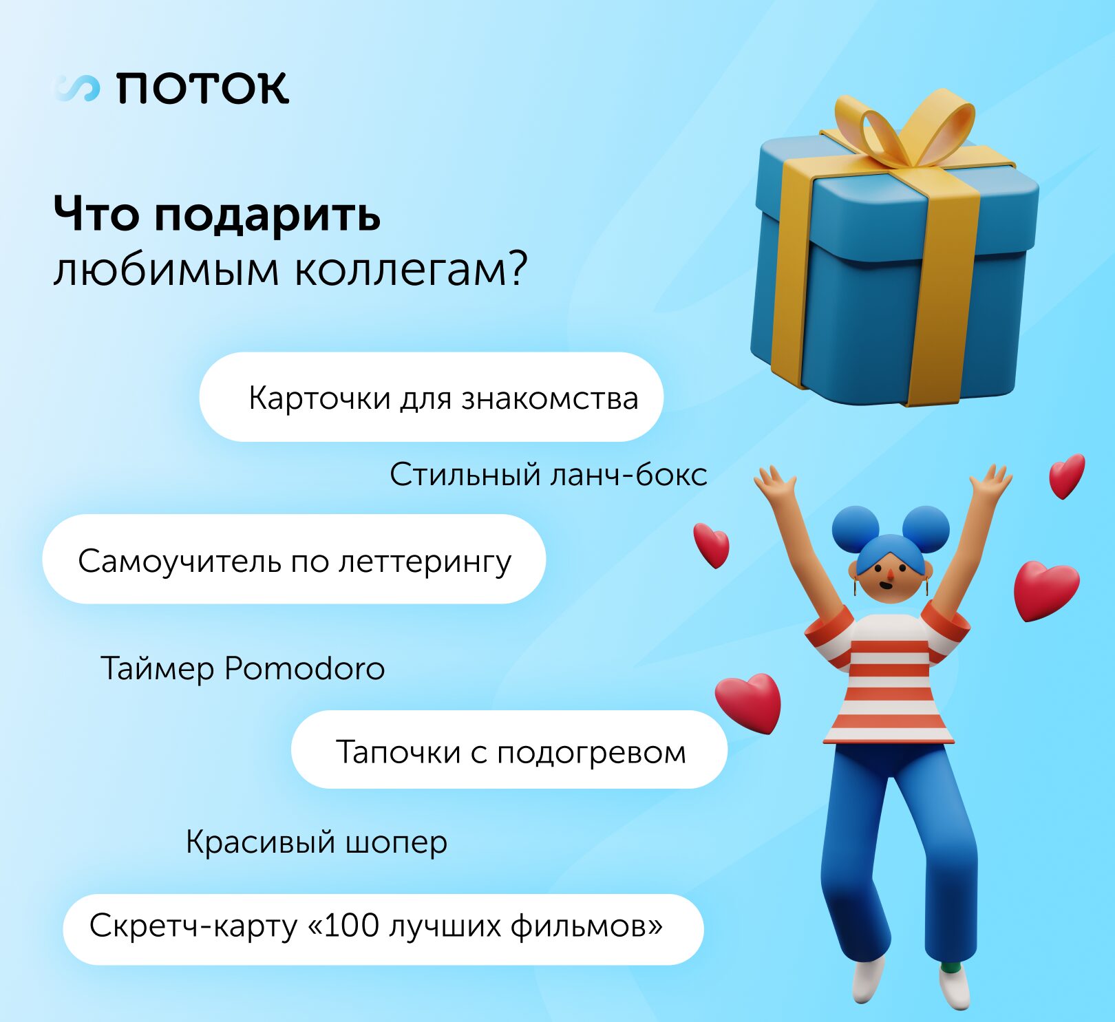 Мы в HRTech-компании «Поток» собрали подборку оригинальных подарков коллегам и партнерам: небольших по нашим меркам, полезных или приятных, в меру странных. Большинство из них до 1000 рублей, некоторые в районе 5000. Сразу предупреждаем, в нашей подборке нет никаких визитниц, дорогих ручек, флешек и внешних аккумуляторов, об этом вы прочитаете в каком-нибудь другом блоге 🙂