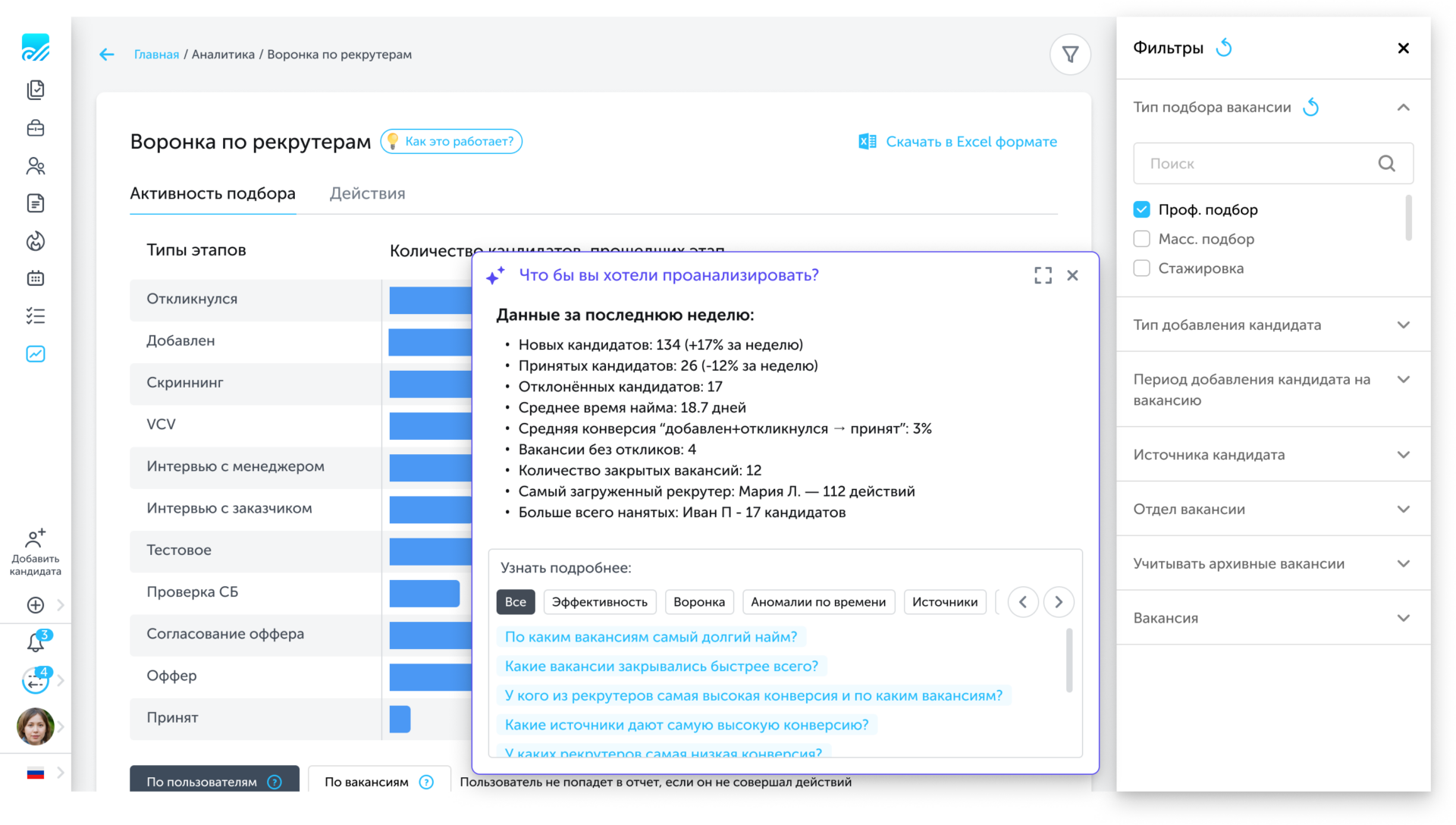 ИИ-помощнику можно задать конкретный вопрос — например, «Кто нанял меньше всего?» или «Какие источники дают лучший результат?», и получить четкий ответ. При этом искусственный интеллект не ограничивается цифрами, он поясняет причины изменений и показывает слабые места в процессе найма.