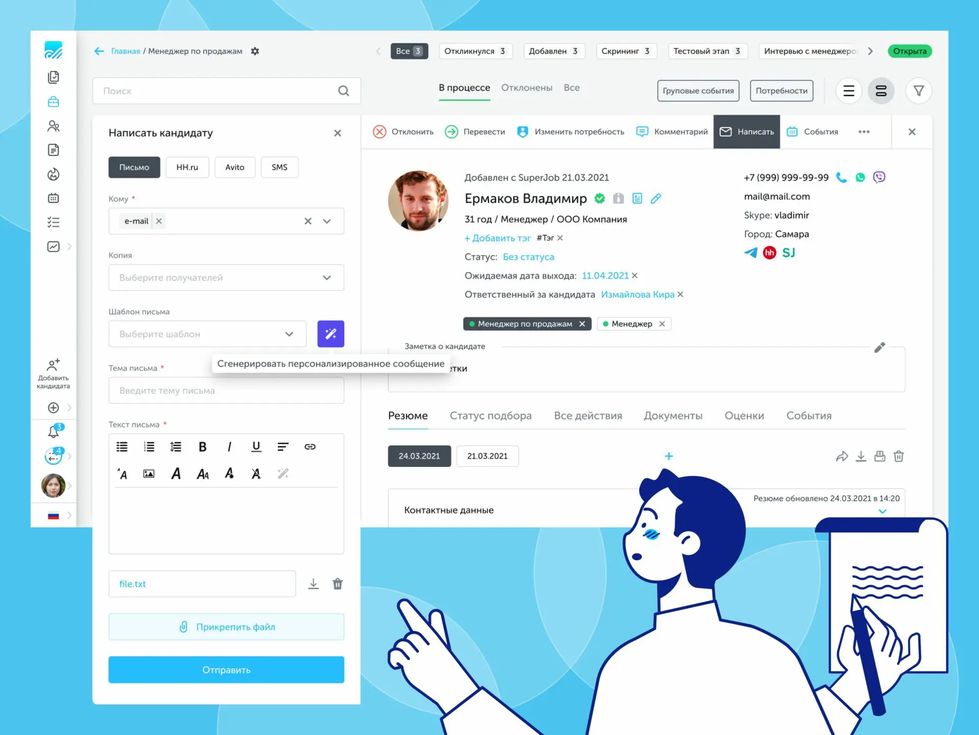 Кандидаты все чаще ожидают индивидуального подхода и быстро понимают, где письмо написано вручную, а где — обычный шаблон. ИИ-рекрутер умеет создавать персонализированные сообщения автоматически, опираясь на текст вакансии и резюме кандидата.