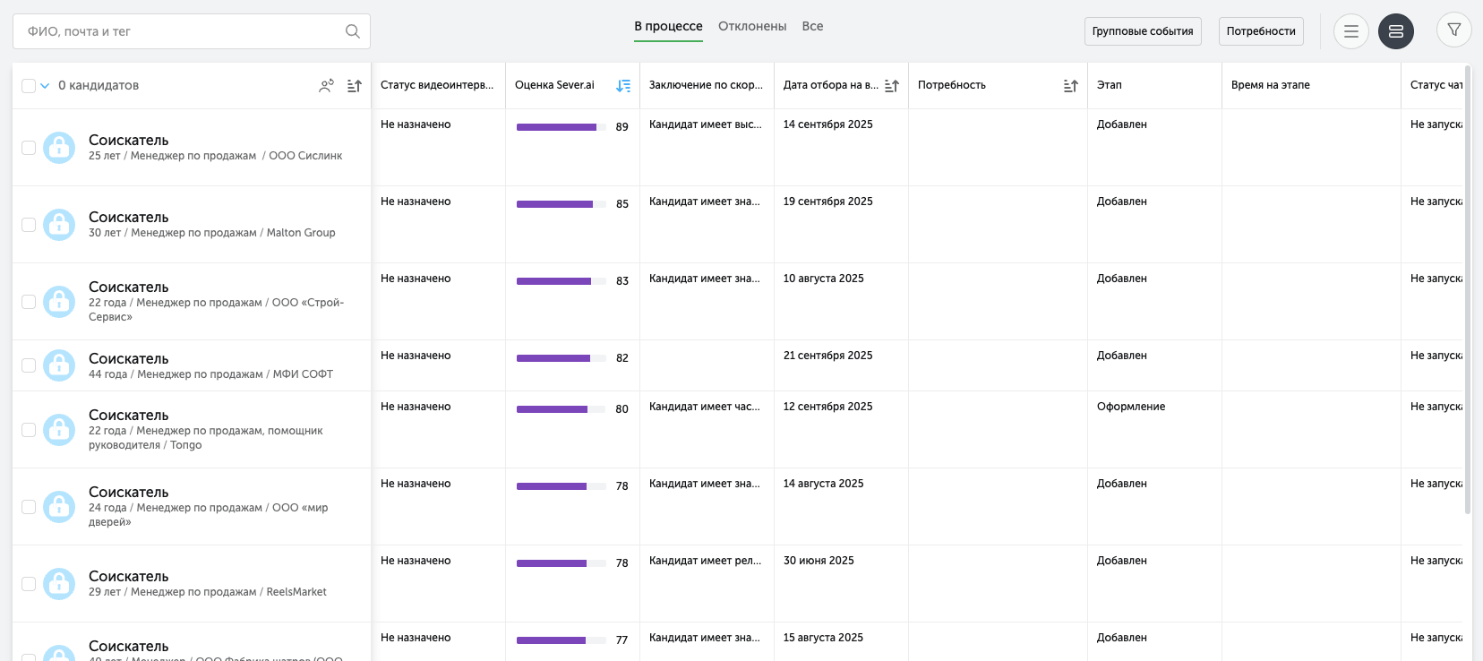 Каждому кандидату присваивается оценка от 1 до 100 баллов. Такой формат позволяет быстро увидеть, кто максимально соответствует требованиям. Кандидаты с низкими баллами автоматически отсеиваются, а рекрутер сразу получает готовый список претендентов, с которым удобно работать.
