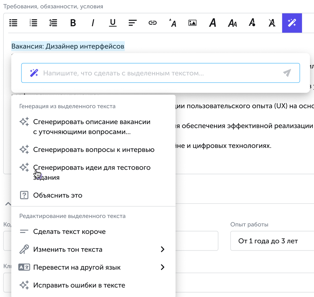Подготовка описаний вакансий, вопросов для интервью и тестовых заданий — еще одна «боль» рекрутеров и заказчиков. ИИ-ассистент помогает создавать продающие и понятные тексты вакансий в один клик, в заданном стиле и с учетом Tone of Voice компании. Это помогает сформулировать описание без размытых формулировок и привлечь целевой поток соискателей.